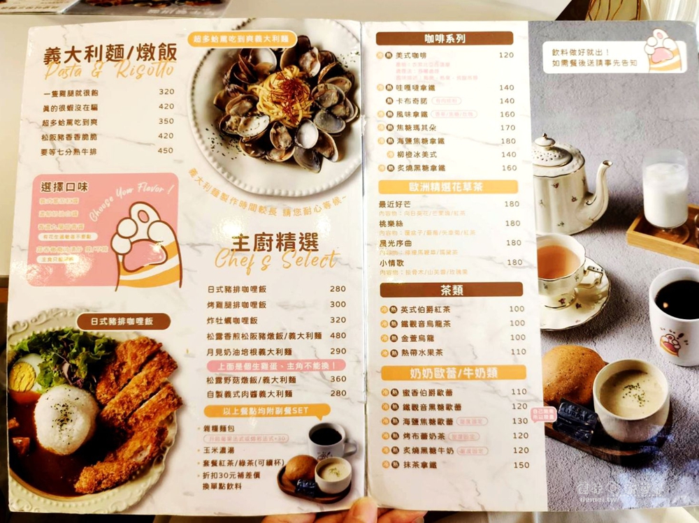無論是第一口咖啡香,或午後的甜食時光,這裡都能找到心情剛好的味道。哇嘎噠的菜色相當多元,從早午餐拼盤、法式吐司、義大利麵燉飯,到咖啡、花草茶與氣泡飲,選擇充足。